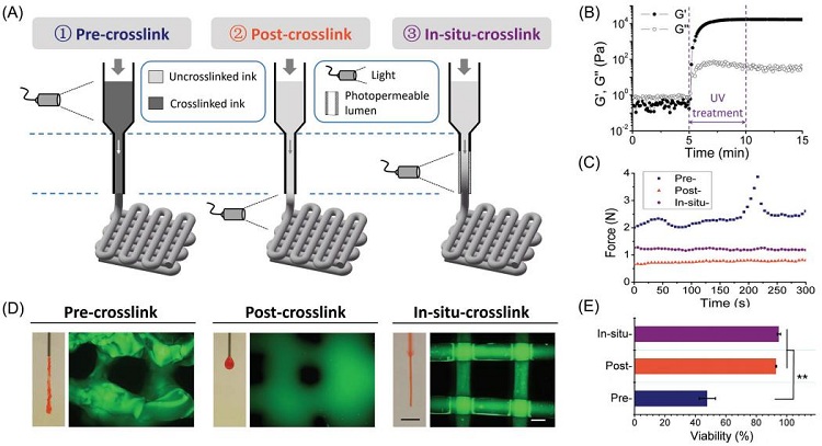 (A)三种不同固化可交联水凝胶的方法,即挤出前、挤出后和挤出时(原位交联)固化;