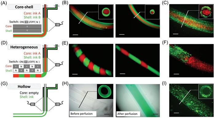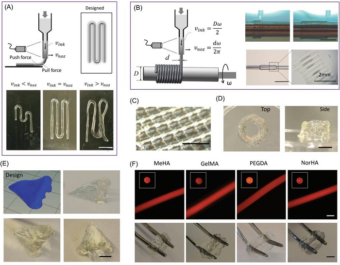 对生物功能组分(如细胞、细胞外基质、生长因子)在类组织支架中进行三维的控制对组织工程至关重要。3D打印在这一领域中受到人们的关注,由于其能够将材料和细胞一起打印成组织,并且可以实现高分辨、复杂的因具体应用和病人而异的设计。但是大部分的3D打印方法都需要将生物墨水挤压出去然后迅速固化,因此生物墨水需要是黏性的或者需要其它因素使其固化(如温度、离子)。
