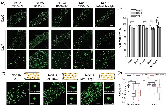 最近宾夕法尼亚大学的Jason A. Burdick(通讯作者)等人提出了一种“原位交联”的方法来解决上述问题。他们在挤出口前端使用可透光的毛细管(图1A),光可以透过毛细管使里面的水凝胶发生固化,但是又不影响其挤出性能。这种方法不需使用添加剂、适用于不同的水凝胶、细胞存活率高并且还能打印异质的和复杂的结构。