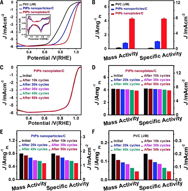 图13 PtPb纳米片/ C、PtPb纳米颗粒/ C以及商业化的Pt / C催化剂的ORR电催化性能