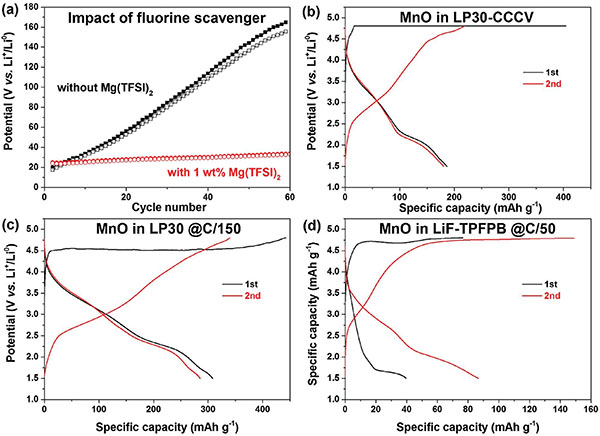 (a)MnO 在LiPF6电解液中添加1 wt% Mg(TFSI)2研究F–的影响,结果表明电解液中的F–与MnO电极的电化学活性联系紧密