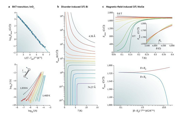 在由分子束外延制备的Ga晶体三层薄膜中超低温下磁电输运特性的研究展示了在零磁场环境下的BKT转变,并揭示了在随磁场强度变化的电阻曲线中存在的多重交叉点。此外,在LaAlO3/SrTiO3(110)界面上也观察到了类似的现象。要想更深入的理解格里菲斯奇点的意义,就有必要考察其他例如InOx这种传统薄膜的数据进行分析。