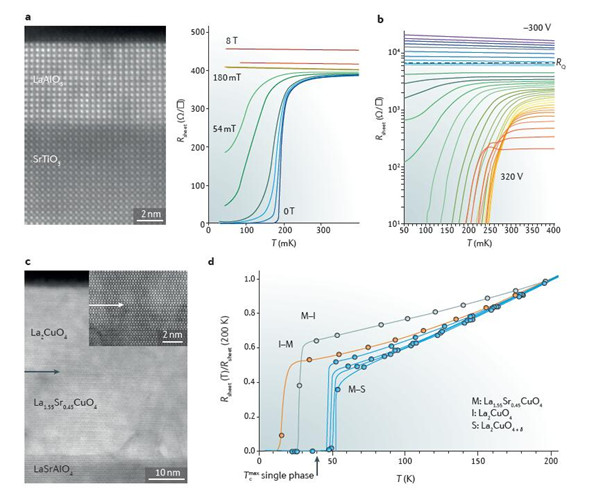 在沉积的非晶或者颗粒状薄膜中,二维超导体的超导-绝缘态转变最为明显。2007年,二维电子系统的界面超导体首次通过脉冲激光沉积的方法在LaAlO3/SrTiO3的(001)极化界面上制备出来。这对于二维超导特性的研究是突破性的进展,原因就在于相比传统的金属薄膜,LaAlO3/SrTiO3的异质结界面拥有更高的电子迁移率。随后进行的实验也证明了其超导体-金属-绝缘体转变的特性。此后,人们又陆续对LaAlO3/SrTiO3体系的超导特性进行了深入的研究。除此之外,在铜酸盐中也观察到了超导性的存在,例如La1.55Sr0.45CuO4 和 La2CuO4。尽管在它们的单相层中有一个非超导金属M和一个绝缘体I,但是当它们结合在一个双层中时随着沉积顺序的不同而具有不同的临界温度Tc:I-M双层时为15K,M-I双层时为30K。包括界面间电子的重构、氧空位以及间隙缺陷都被认为是Tc增强的来源,但是,在这个问题的讨论尚未达成一致。由分子束外延制备的拓扑绝缘体和铁的卤族化合物Bi2Te3/ FeTe的异质结间也观察到了超导特性,此系统中的输运特性是二维的,存在于约7nm厚的薄层中,然而,其超导性的起源尚在讨论之中。