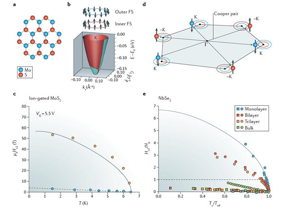 最近出现的无空间反演对称的高结晶二维超导材料表现出了相比外磁场更稳定的超导态,这都归因于SOI的反常效应。一般情况下,二维超导材料的面内上临界磁场由无穷大的轨道极限决定,因此,泡利极限在磁场几何学中起决定作用。在早期的工作中,平行的上临界磁场强度大于通常的泡利极限,这是因为强大的自旋-轨道散射效应引起的在高Z元素或具有较大原子SOI的层状材料中的自旋随机化。实验中在MoS2和NbSe2体系中都观察到了增强的上临界磁场现象,并进行了讨论。其中一种可能的解释就是其内在机理起源于高度结晶的MoS2导带平面的自旋谷锁定。根据第一能带原理的计算,导带在K和-K谷处是自旋分裂的。并且在面外方向几乎是完全自旋极化的。在外界磁场中,由于时间反演对称的存在,K和-K谷处的自旋极化是相反的。为了伴随零质心动量形成单线态匹配,库珀对必须在K和-K谷之间形成。这些谷之间的配对被内部面外的磁场所保护,也就是说,除非外界磁场强度超过内部,否则库珀对会稳定存在。上述的定性解释说明了增强的上临界磁场是由于自旋-谷的锁定效应。此机理也可用于解释依辛(Ising)超导性或依辛对。