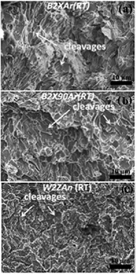 该文作者运用电子束选区熔化制备了铁素体不锈钢。在图a、b和c中,解理面(cleavage)的出现证明了此时拉伸断口为脆性断口,说明了在该熔融工艺中材料的脆性比较大。