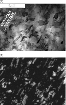 作者对AA7039+20%SiCw的热挤压加工进行了研究。通过透射电镜,作者发现SiC晶须会沿着挤压方向有着明显的分布(挤压比0.33),并且大量的SiC晶须在挤压过程中发生了断裂。尽管SiC晶须断裂,但是其依然与基体有着很好的结合。