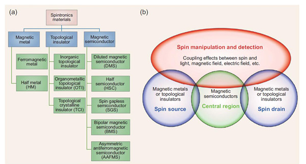 尽管自旋电子器件具有很多潜在优势,但同时也面临着很多问题,例如完全自旋极化载流子的产生和注入、自旋的长程传输以及自旋方向的调控和探测。这些问题的解决一方面依赖于器件制造工艺的优化和发展,另一方面也需要有目的性地进行新型自旋电子材料的设计。根据材料电子和磁学特性的不同,自旋电子材料可分为以下几类:磁性金属、拓扑绝缘体(TI)和磁性半导体。一般来说,实用的自旋电子学材料需要在室温下保持磁有序并且具有环绕费米能级周围较大的自旋极化。