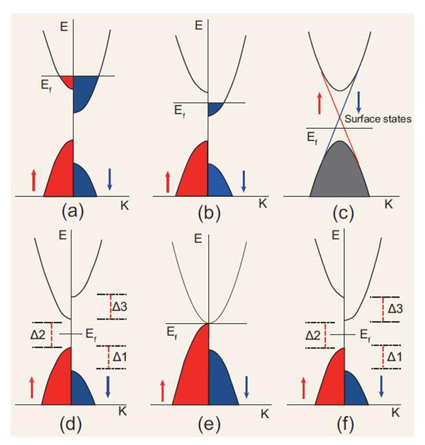 (a)铁磁金属;(b)半金属;(c)TI;(d)HSC;(e)SGS;(f)BMS