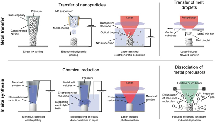 液体局域分配离子电镀(Electroplating of locally dispensed ions in liquid)技术:通过浸泡在支持电解质中的亚微米尺寸喷嘴将金属离子溶液进行局域分配,对基底的阴极电势会促使局域的电化学沉积;