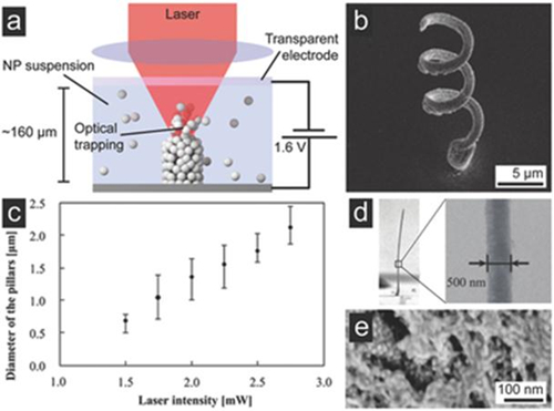 (a) 通过激光来局部聚集溶液中的纳米粒子,同时施加电场使粒子沉积并致密化;