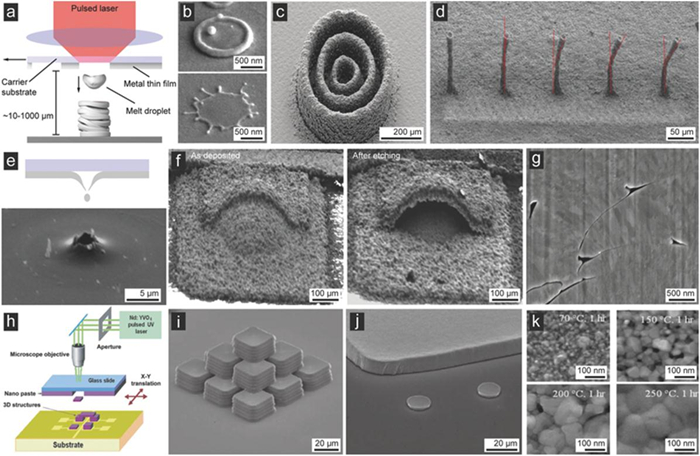 激光诱导转移(Laser-induced forward transfer, LIFT)技术:金属薄膜吸收激光脉冲,从而喷出熔融金属液滴,液滴随后在基底上固化;