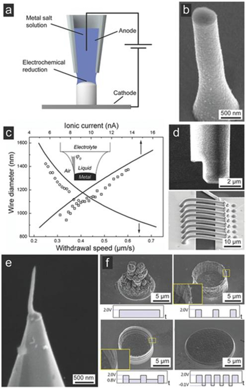 (a) 原理:通过浸泡在支持电解质中的亚微米尺寸喷嘴将金属离子溶液进行局域分配,对基底的阴极电势会促使局域的电化学沉积;