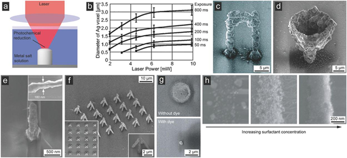 (a) 原理:通过双光子吸收作用来激发感光性溶液中金属离子的局域光致还原作用;