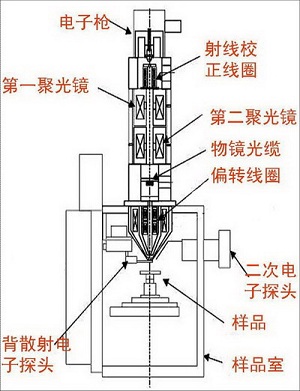 SEM工作过程:将一束极细的经过电场加速的电子束扫描样品,在样品表面激发出多种电子信号(二次电子、背散射电子、X射线、吸收电子、俄歇电子等),激发出的次电子与样品的表面结构有关,次电子由探测器收集,并被转化为光信号,经过光电倍增管和放大器将信号放大后转变成电信号,最后被送至显像管的栅极上并显示出薄膜的扫描图像。