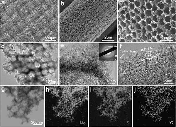 a-c)SEM图像和 d-f)不同放大倍数的TEM图像, g-j)Mo,S,C元素的TEM-EDS图。