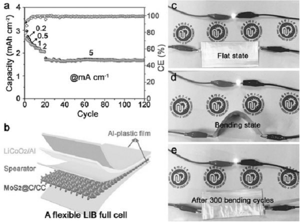 为了解决这些问题,近日,华东理工大学江浩教授、李春忠教授、刘宇博士联合在Advanced Materials发文,题为“3D Ordered Macroporous MoS2@C Nanostructure for Flexible Li-Ion Batteries”。研究人员提出了一种新型灵活和可折叠的高性能锂离子电池,通过设计3DOM MoS2@C纳米结构和将其在碳布(标记为MoS2@C / CC)上原位组装。用于提高LIB性能的3DOM MoS2@C的关键特征是超小量的多层MoS2纳米片/碳混合物形成3D大孔结构,这避免了MoS2的堆叠/重新堆叠,并留下足够的空间用于解决在充电和放电过程中的与体积膨胀相关的问题。因此,3DOM MoS2@C/CC负极在0.1 mA cm-2下具有3.428mAh cm -2的高放电容量,具有快速充电/放电能力(在5mA cm-2时为1.361mAh cm -2)和优异的循环稳定性(100次循环后的93%容量保持率)。量子密度功能理论(QDFT)计算表明边缘富集的超小型和少量少层的MoS2纳米片有利于提高锂存储容量。分别使用合成后的MoS2@C/CC和商业LiCoO2 /Al作为正极和负极组装高的柔性全电池,表现出优异的机械强度和优越的电化学性能。