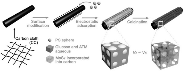 本图表明了在碳布上的3DOM MoS2 @ C结合结构的典型制备过程。在第一步中,通过在N-甲基-2-吡咯烷酮溶剂中聚苯胺的改性获得一片带正电荷的碳布。然后,将带负电荷的聚苯乙烯(PS)纳米球均匀分散在硫代钼酸铵(ATM)和葡萄糖水溶液中,随后基于静电吸引在碳布表面上自组装PS纳米球 。然后,通过匹配在碳化期间的ATM分解速率和葡萄糖碳化速率获得MoS2 @ C / CC柔性电极。