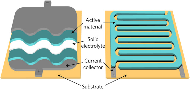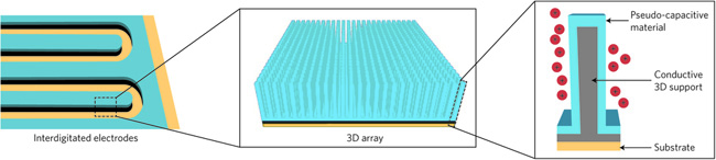 迄今为止,薄膜微型超级电容器的缺点是能量密度低,不足以做功率传感器以及其他电子部件,它的不足之处源于大多数薄膜器件中活性材料的量较少,电荷存储量低。为了改善这一问题,需要在每个电极单位面积上负载更多的活性材料,制备更薄的电极,当然,微型超级电容器电极的厚度只要能够保证材料有足够的机械稳定性即可。最近,伴随着三维微型电池的概念逐渐流行,微型超级电容也开始逐步发展三维电极结构,包括堆叠或者共平面结构。三维设计仅仅意味着阴极和阳极的表面暴露在三维空间而不是像传统薄膜电极一样的二维平面表面。现在已经合成出来多种有着高比表面的自支撑平面集流体,包括各种纳米结构,比如纳米线、纳米管、纳米片、纳米墙。这些结构提供了一种与基底能够很好结合的垂直排列纳米结构的三维网络,无需任何键和导电剂就具有优异的导电性;在不用牺牲整个孔隙基本形态的基础上,可以在平面维数外利用化学沉积或电化学沉积生长一层赝电容材料。