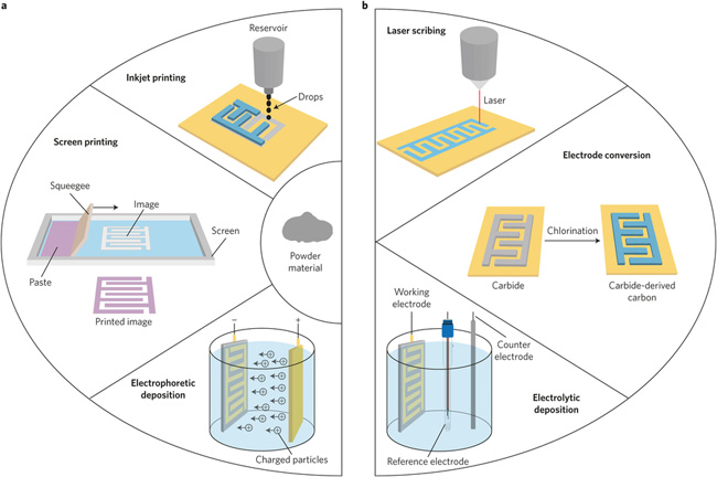 迄今为止,报道了多种方法可以实现在不超过1 cm2的面积上制备亚毫米级结构图案的芯片超级电容器。这种平面结构制备的挑战在于保证正负极不短路的情况下获得微型图案化的电极材料,更困难的是制备方法必须与半导体工业制备兼容以保证其他与电子器件的协调统一。制备方法取决于图案的分辨率,也就是叉指结构中两个相邻电极的最小距离,一般在5~500微米范围之间。制备方法可以分为两大类,一类是将现存的粉末电极材料转移到微型电池中,粉末颗粒分散在溶剂中形成稳定的胶态悬液或者粘稠状调料,是活性材料、粘合剂、表面活性剂、填料和导电剂混合组成。将混合物原位沉积在金属集流体上,金属集流体是绝缘基板上事先通过不同的印刷法或者电泳图案法设计好的;第二类方法是在制备微型器件的过程中直接合成电极材料。这两类方法都已经成功地生产出无包膜的微型器件,在空气条件下和手套箱控制气氛的条件下都成功进行了测试。然而,为了制备完整的芯片微型器件,包装问题仍然是一个待克服的基本问题,但仅仅有一小部分研究试图解决这个问题。