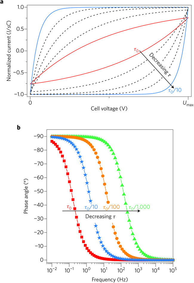 超级电容器从其定义上来说是一种功率型器件,在高倍率下仍能保持高的电荷存储量。超级电容器主要在直流条件下工作,因为在高频交变电流下,电极材料的多孔会作为主导带来一定电阻。然而,一些研究也报道了叉指型微型超级电容器在高频条件下能够保持电容性能,电压扫描速率最高可达100 V/s,高于传统超级电容器三个数量级。这些意想不到的行为可能是由于以下一些因素综合导致的:特殊的电极材料(比如碳洋葱中离子的吸附脱附行为可以完全在表面进行);在制备电极材料的过程中缺失有机粘合剂以及使用优化配置。事实上,叉指中较小的间距可以减少电池常数和电解质电阻(等效串联电阻的主要来源),所有的这些参数都低于电池电阻R,于是极大地减少了积累和传递能量的时间。从超级电容器的循环伏安公式可以看出,保持矩形的最大扫速取决于时间常数τ(τ=Rc),τ越小,代表能够保持CV为矩形的扫速更高。同时,在高频率下保持好的电容行为,在波特图中相位角接近-90度,这也取决于时间常数τ。