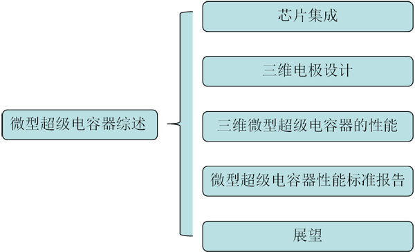 作为电化学储能器件,微型超级电容器基本结构包括正负电极和分离两者的导电离子电解质。最早的微型超级电容器灵感来源于薄膜微型电池技术的发展,薄膜微型电池是由两个RuO2电极和电极之间的固态玻璃电解质组成的三明治结构,早先的器件由于离子导电性和极化性差,所以比电容和功率较低。其他的微型超级电容器已经可实现多种电极材料在平面上组装,大多数是在绝缘基板上做成叉指型图案。
