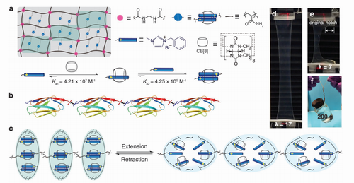 在这方面,英国剑桥大学梅尔维尔实验室高分子合成团队Oren A. Scherman(通讯作者)等人提出了一种新型的类水双重网络结构。交联结构维持双重网络的形状和弹性。超分子主客体的相互作用同时提高了几种机械特性:(1)通过破坏主客体复合物,将此作为牺牲键来增强整体网络的韧性;(2)通过重构主客体复合物提高抗疲劳强度和自动恢复能力;(3)通过复合物的动态的分离和重结合分散了体系能量。该成果以“Biomimetic Supramolecular Polymer Networks Exhibiting both Toughness and Self-Recovery”为题于2017年1月16日发表在期刊Advanced Materials上。
