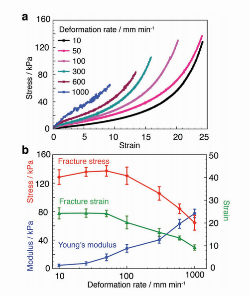 a) 在不同的初始变形速率(从10到1000mm·min-1),单轴拉伸行为下的超分子双网络(哑铃形状)。