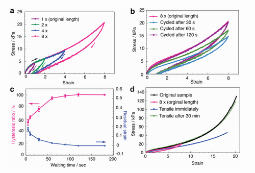 d)直接拉伸试验的样品(蓝色曲线),在第一次加载/卸载循环应变的8个样品(粉色曲线),和在室温下停留30min的自我修复样品(绿色曲线)。原样品曲线(黑色曲线)和自我修复样本 (绿色曲线)高度重叠,表明通过超分子主客体复合物的重构实现了快速自动复位的力学性能。
