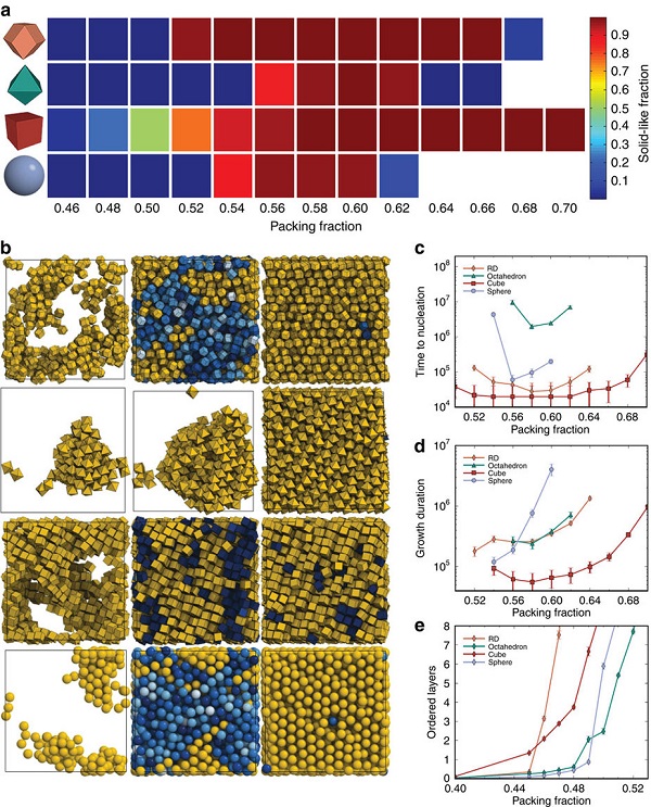 (a). 密度范围,其中使用从快速压缩到选定堆积密度的配置开始的等容模拟,对于每个颗粒形状发生均匀成核和生长。在密度和形状的网格矩形的计算系统平均局部为菱形十二面体,八面体,立方体和球体。