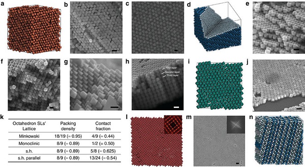 (d-j). 八面体超晶格的分析. 在模拟中,发现了Minkowski超晶格(d). 在实验中我们观察单斜超晶格,Minkowski 超晶格(e,f), 简单的六边形超晶格(g), 在模拟(i)和实验(j)单层八面体超晶格中的六边形包装中的壁.