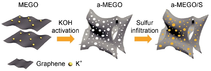 用高比表面积~3000 m2g-1和孔容2.14 cm3g-1的活化石墨烯作为碳基体,负硫量可高达75%。如图2所示,以微波剥离氧化石墨MEGO为前驱体,再用KOH活化制得微孔/介孔活化石墨烯a-MEGO;随后再与硫复合,得到硫/活化石墨烯复合材料a-MEGO/S,在1C电流密度下,200次循环后的容量保持76%。