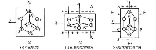 压电效应是由于晶体在机械力的作用下发生形变而引起带电粒子的相对位移,从而使得晶体的总电矩发生改变而造成的。晶体是否具有压电性与晶体结构的对称性有关,只有具有不对称中心的晶体才有可能具有压电特性。因为压电晶体首先必须是不导电的,同时结构上还必须要有分别带正电荷和负电荷的质点—离子或离子团的存在。因此,压电晶体还必须是粒子性晶体或有离子团组成的分子晶体[1]。
