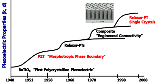 铅类化合物的毒性威胁人类健康、破坏生态环境,因此无铅压电陶瓷材料成为主要的研究热点。但由于其压电性能偏低且不稳定,工艺复杂难以控制,极大的限制了无铅压电材料在器件中的应用,市场上无铅压电材料占比极少。典型的无铅压电体系有KNN-BNT,KNN-BT,BNT-BT,BKT-BT,BNT-BT-KNN及BNT-BKT等。据报道,无铅压电材料有望在10年之内进入市场应用[2]。
