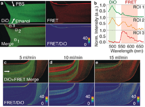 根据该文章作者的设计,自组装纳米颗粒在微流控装置中通过连续流形成;同时,FRET显微成像技术也应用在该装置中。为了实现这个设计并测试其普适性,作者在不同合成环境、材料组成下对三种被广泛使用的自组装纳米颗粒系统:纳米乳、聚合物胶束、重组的高密度脂蛋白进行了研究;并对每一个系统都引入了不同的FRET供体-受体对,对多个影响自组装纳米颗粒合成的因素进行了研究。该文章展示了作者对上述三种不同的自组装纳米颗粒形成过程进行实时可视化的成果,从而介绍了通过FRET成像对纳米颗粒的形成进行实时观察的技术。该技术有望加深人们对各种类型纳米颗粒的合成、形成机制以及功能的了解与研究。