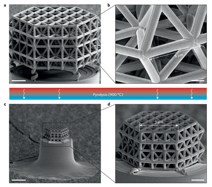 采用双光子光刻型三维激光写入技术制备了一种聚合物微米晶格,其圆柱直径和长度分别为1um和5-10um。通过裂解过程,可以使紫外线固化的树脂转化成具有优异物理性能的尺度更小的碳结构,即纳米晶格。通过原子层沉积技术/聚合物转化陶瓷/空心陶瓷结构技术能获得非常高的强度(密度在1g/cm3以下),甚至可以达到理论强度。