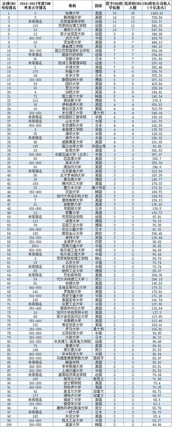 日前,泰晤士高等教育发布了2017年度全球CEO母校排名。该榜单与我们所见到的其他大学榜单不同,是以大学授予世界五百强首席执行官的学位数量为评选依据,共收入全球一百所大学。