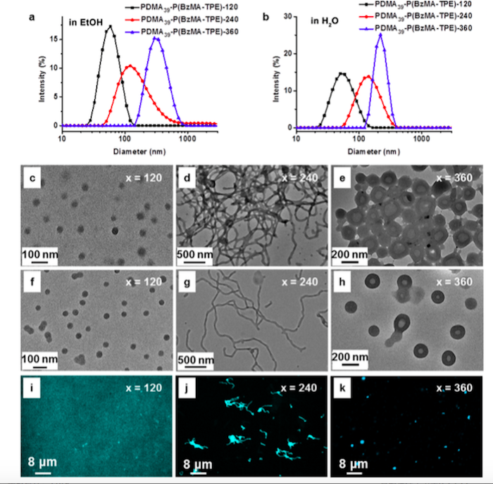 i-k) 利用PISA聚合得到的不同单体含量对应的聚合产物的不同形态。其中i为PDMA 39 -P(BzMA-TPE)-120,得到平均流体动力学直径(Dh)为41.3±4.2nm的球形胶束。j为PDMA 39 -P(BzMA-TPE)-240,得到平均流体动力学直径(Dh)为51.7±6.0nm的蠕虫状胶束。k为PDMA 39-P(BzMA-TPE)-360,得到更大和更亮的球体。