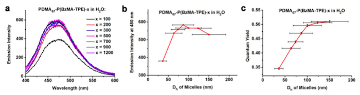 a) 为具有不同尺寸的PDMA 67 -P(BzMA-TPE)胶束的水性分散体的荧光光谱。