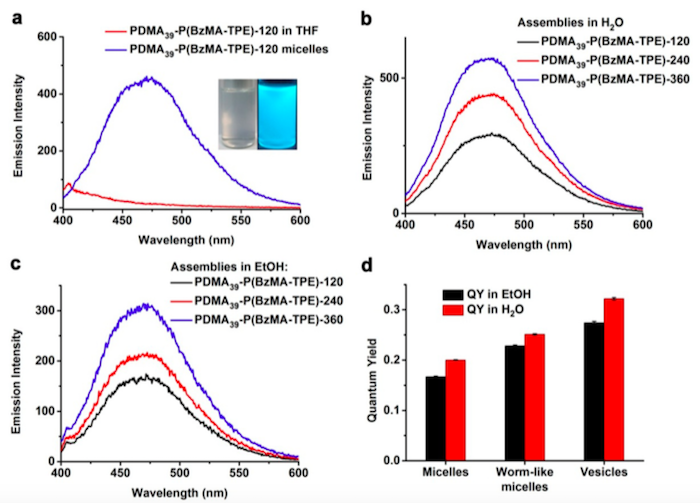 c) 在乙醇中的PDMA 39-P(BzMA-TPE)-120,-240和-360组件的FL光谱。通过b和c对比发现组件在水和乙醇中的荧光强度随组件形态而变化。且在480nm处的谱峰强度有如下关系PDMA 39 -P(BzMA-TPE)-120(胶束)<PDMA 39 -P(BzMA-TPE)-240(蠕虫状胶束)<PDMA 39 -P -TPE)-360(囊泡)。而对于相同的聚合物,在水中比在乙醇中具有更强的荧光强度。