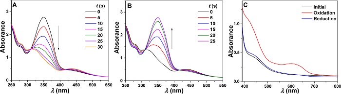 (A)365 nm UV光。反式聚合物溶液在350 nm显示特征峰,在440 nm显示小峰。当曝露于UV光时由于偶氮苯的Π-Π*跃迁和n-Π*,350 nm的峰显著降低,并且440 nm的峰轻微增加,证实了偶氮基的顺反式光异构化。