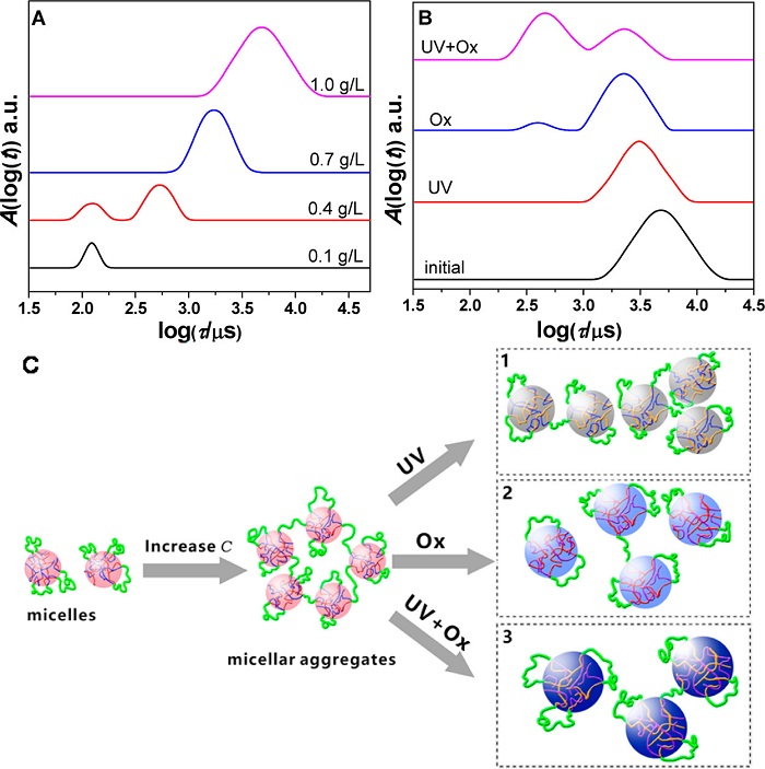 (A)在指示浓度下,0.1g/L的聚合物溶液仅显示溶液中单个胶束的快速迟豫行为。当浓度增加至0.4g/L时,在快速模式中还观察到了缓慢的松弛行为。该慢松弛行为应该归因于Chasssenieux等人提出的由AzoFc-HEUR连接的胶束聚集体的开放缔合机制。随着AzoFc-HEUR量的进一步增加,慢模式的峰变宽,表明形成了更多更大的胶束聚集体。而散射强度依赖于颗粒的尺寸,一旦胶束聚集体出现,尺寸更大的DLS信号更强。结果表明,在相对高浓度下不能观察到小胶束的快速模式。