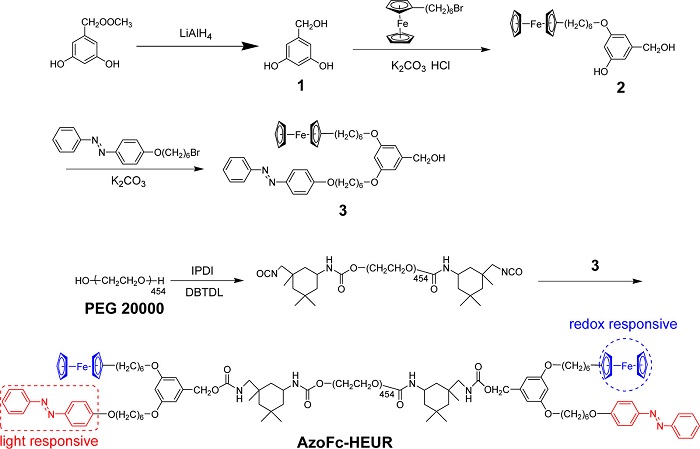 疏水改性的乙氧基聚氨酯(HEUR)属于一类重要的遥爪缔合聚合物,常用于改进许多工业领域的溶液流变性能。由亲水链和疏水端基组成的遥爪聚合物可以在水中彼此缔合,以形成各种纳米结构。作为这样的遥爪聚合物之一,HEUR可以在高于临界聚集浓度(cac)的水溶液中形成由花环(亲水主链)和胶束核(疏水端基)组成所谓的花胶束。随着浓度的增加,花胶束的数量密度增加,一些链的额外端基将连接到不同的胶束核中以连接胶束,而末端的疏水物可以动态地附着到胶束核上并与胶束分离,所形成的网络可以在有限的松弛时间内显示出流变性质。因此HEURs聚合物被广泛的用作流变改性剂,用于改善许多工业领域中溶液的流变性能。另一方面,偶氮苯(Azo)、二茂铁(Fc)、螺吡喃(SP)等刺激反应性基团由于其可逆的物理化学性质变化而广泛用作功能材料和器件制造反应外部刺激。这种刺激响应性基团对外部刺激的两亲性变化已经用于调节稀水溶液中功能性聚合物的自组装和拆解。