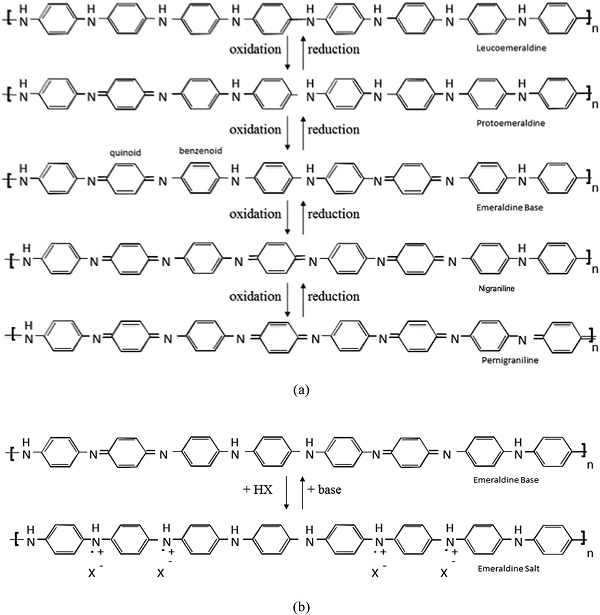 导电聚合物的氧化还原态和掺杂机理是受到广泛关注的部分。对于聚苯胺来说,其具有三种主要的氧化态:全苯式结构(全还原)、中间氧化态(半氧化)和全醌式结构(全氧化)。不同的状态具有不同的结构,并表现出不同的性质。