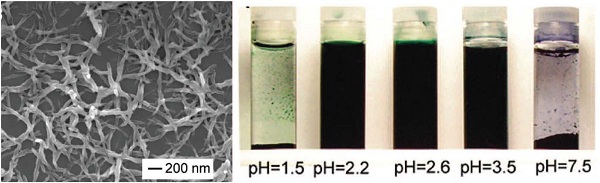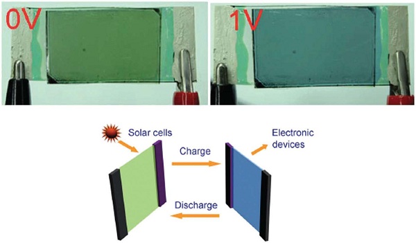 导电聚合物是一种出色的电致变色材料。当导电聚合物的氧化态发生变化的时候,其颜色会急剧变化,当给导电聚合物薄膜加上电势时,其颜色就会改变。变色薄膜拥有广泛的应用,例如在冬季透光透热而夏季反射辐射能量的窗户、柔性显示器、镜子以及其他器件。利用产生相反电荷的材料组成的叠层结构就是实现这些应用的直接方法。掺杂、去掺杂以及半掺杂的聚苯胺纳米纤维都可以形成叠层结构。由于其在不同pH中极高的稳定性,因此实际中常常使用自掺杂的纳米纤维。