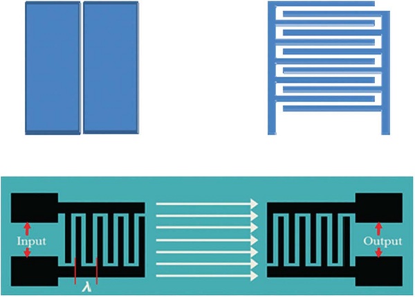 图3 用于测量传感器电阻变化的间隙电极(上左)和叉指电极(上右)以及表面声波器件(下)