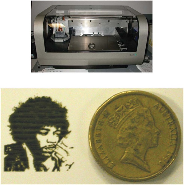 图4 使用Dimatix打印机(上)和碳纳米管-聚苯胺复合墨水打印吉米·亨德里克斯的图案(下)