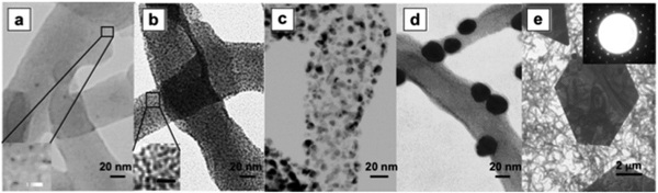 金属化合物和聚合物纤维的不同组合已经在超级电容器、传感器、催化剂和非易失性存储器领域得到了应用。这些复合物中许多都利用了聚合物自身的氧化还原特性,即其可以自发地还原一些金属,尤其是贵金属,并形成均一的金属纳米颗粒。聚合物纳米纤维在氯金酸中时可以作为金纳米颗粒形成的模板,形成均一的纳米颗粒并附着其上。通过改变反应温度、反应时间以及稳定剂可以控制金纳米颗粒的尺寸和形貌。除了金之外,铂、银、钯等贵金属颗粒也可以通过将聚合物纳米纤维暴露在其金属盐中进行制备。