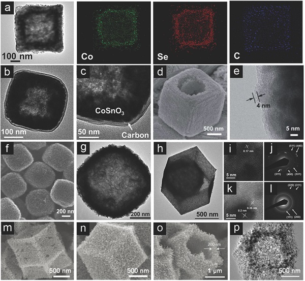 相比起简单的球形或者管状形貌,拥有立方体、碗形或者棱柱形外观的多面体复杂中空纳米结构在电化学性能方面拥有更独特的优势。除了几何形态上的变化,随着能源领域材料的不断更新,中空纳米结构的壳层结构和内部构造也更加精细和复杂。而这些愈加精细的结构被证明可以呈现出更高的堆积密度,由此可以在应用过程中最大程度地保留中空结构的特点,从而使复杂中空结构的能量密度和功率密度得到大幅的提高。除了结构方面,组分控制也是建立复杂中空结构的重要层面。集成多种类型功能材料的杂化系统,特别是纳米复合材料,可以协同增强单一材料各自的性质。例如碳基材料和金属氧化物/硫化物的结合可以明显缓解电化学反应过程中的体积应变,强化协同作用。
