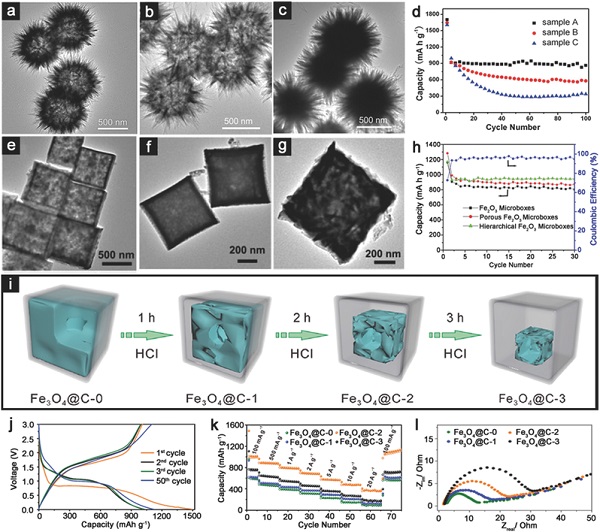 传统商用锂离子电池存在容量衰减快和锂离子扩散速率受限等问题的困扰。而内部空心的纳米结构电极被认为是可以克服这些缺点的潜在材料。因为相比实心的块体电极材料,中空的内部结构更适应重复充放电过程中的体积变化,可以避免电极材料被破坏,有效提高循环性能。尽管存在这些优势,简单中空纳米结构在优化电极材料性能方面的能力非常有限。由于电化学性能与材料几何形态、化学组分以及壳层构造等均有密切的关系,因此复杂中空结构在调控电化学性能方面相比简单中空结构存在着更大的发挥空间。比如说储锂性能就与材料亚单元的形貌息息相关。研究发现,相比起由氧化铁纳米颗粒组织形成的微型盒状,由氧化铁纳米片(nanosheets)组织形成的微型盒状(microboxes)材料的库伦效率以及30个循环后的放电容量更有优势。
