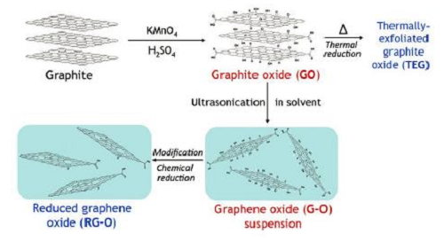 (5)氧化还原法。首先,以天然石墨或者膨胀石墨粉与强氧化剂以及强酸为原料,使它们形成胶体体系,反应后获得氧化石墨烯。这一过程主要以Hummers法[16]最为常用——以浓硫酸和高锰酸钾为氧化剂,氧化石墨粉,氧原子进入石墨层间,与π电子结合,从而破坏层内π键,而在石墨烯片层上形成羰基、羧基等含氧官能团。然后,还原氧化石墨烯获得石墨烯。常用的还原方法有化学还原及热还原等。如图3所示。